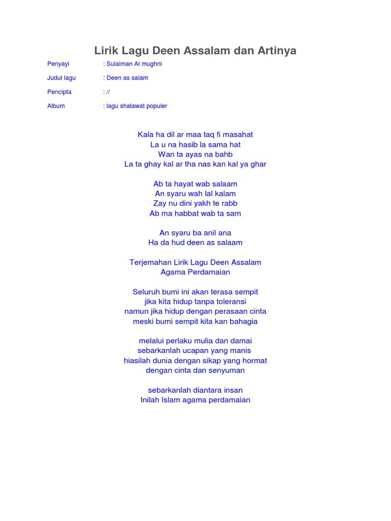 Lirik Lagu Deen Assalam Dan Artinya Lirik Lagu Lagu Lirik