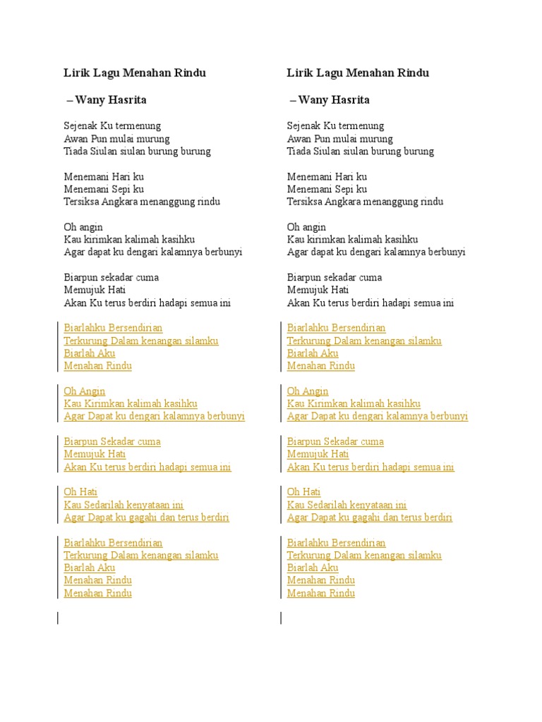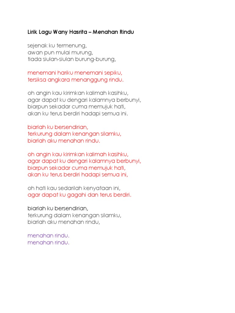 Lirik lagu menahan rindu wany hasrita. Sejenak kutermenung awan pun mulai murung tiada siulan siulan burung burung menemani hariku menemani sepiku tersiksa angkara menanggung rindu oh angin kau kirimkan. Wany hasrita lans rohman. Biarlahku bersendirian terkurung dalam kenangan. Oh angin kau kirimkan kalimah kasihku agar dapat ku dengari kalamnya berbunyi.