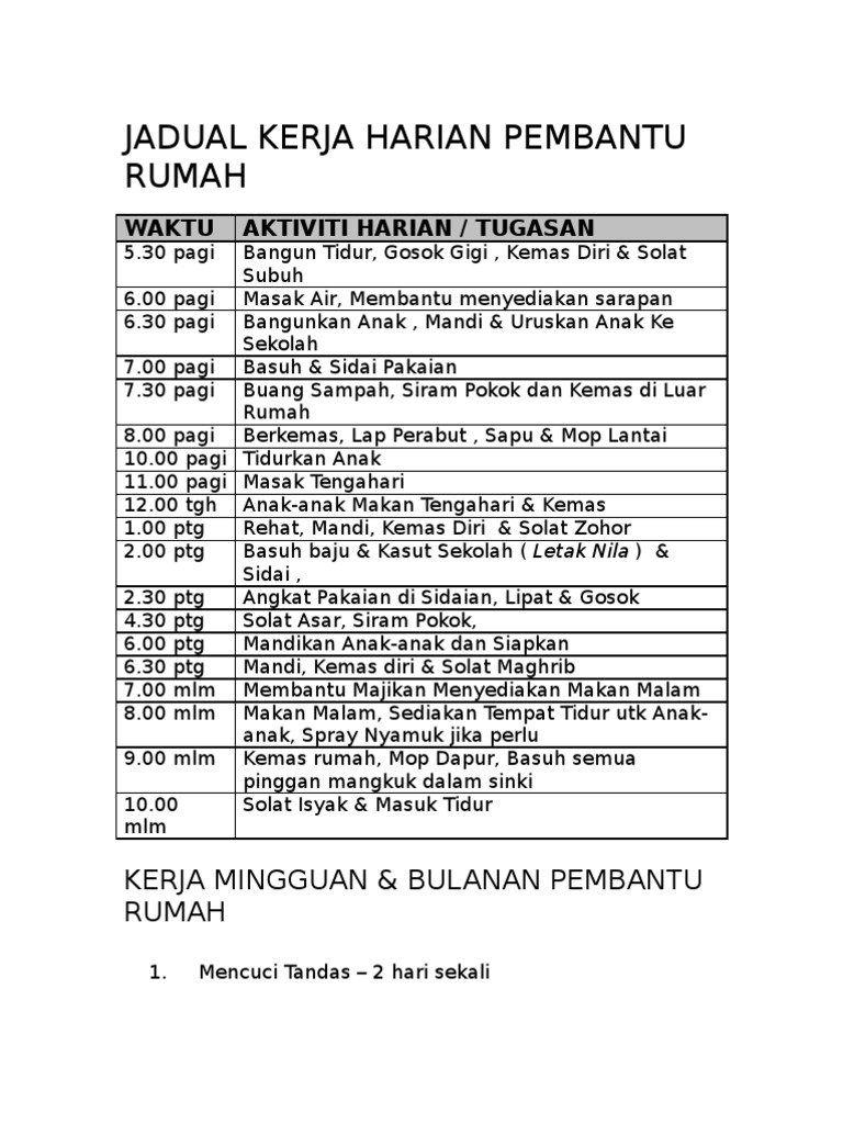 Jadual Kerja Pembantu Rumah Muslim Indonesia Jadual Kerja Harian