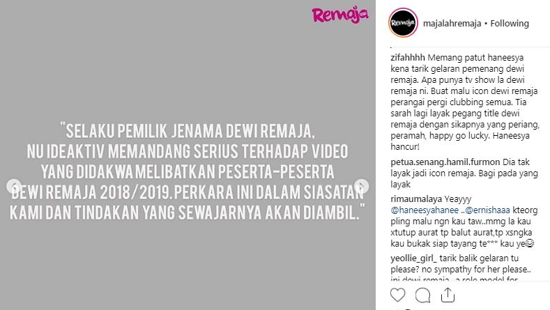 Gelaran Dewi Remaja Haneesya Hanee Ditarik Balik Berita Gaya